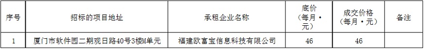根據(jù)思明區(qū)國有企業(yè)資產(chǎn)出租管理的相關(guān)制度,我司2019年4月22日上午9:00于觀音山營運(yùn)中心2號(hào)樓2層2號(hào)會(huì)議室進(jìn)行公開招租現(xiàn)場開標(biāo),現(xiàn)通過思明控股網(wǎng)站對外發(fā)布成交公告,內(nèi)容如下: