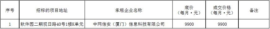 根據(jù)思明區(qū)國有企業(yè)資產(chǎn)出租管理的相關(guān)制度,我司2019年6月10日上午9:00起于觀音山營運(yùn)中心2號(hào)樓2層2號(hào)會(huì)議室進(jìn)行公開招租現(xiàn)場開標(biāo),現(xiàn)通過思明控股網(wǎng)站對(duì)外發(fā)布成交公告,內(nèi)容如下: