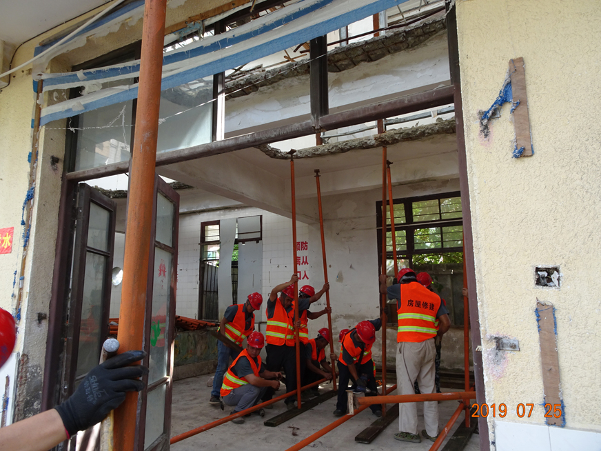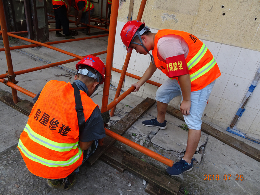 演練中,在現(xiàn)場指揮朱志勝的指令下,我司房屋搶險組組長王小龍迅速組織人員對危房周邊進行警戒圍護,對塌陷變形的混凝土樓板及陽臺板采取鋼管頂撐加固,全組人員按照指令有序配合,順利完成演練內(nèi)容。