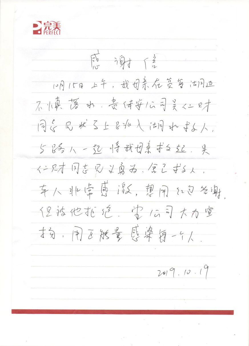 “關(guān)于老人摔倒扶不扶的問(wèn)題,很多人談之色變,面對(duì)群眾危難,不會(huì)游泳的吳仁財(cái)沒(méi)有選擇冷漠和逃避,而是不懼危險(xiǎn),挺身而出、沉著冷靜、奮勇救人,真是驚心動(dòng)魄,當(dāng)時(shí)水已經(jīng)淹到我母親胸口位置,情況萬(wàn)分危急,若是再晚一分鐘施救就陰陽(yáng)相隔了……吳仁財(cái)同志也是挽救了我們整個(gè)家庭!”被救的老婦人兒子章先生情緒十分激動(dòng),噙著淚花如是說(shuō),一再感謝善良保安員吳仁財(cái)同志的救命之恩并準(zhǔn)備了紅包答謝,被吳仁財(cái)同志婉言謝絕了。
