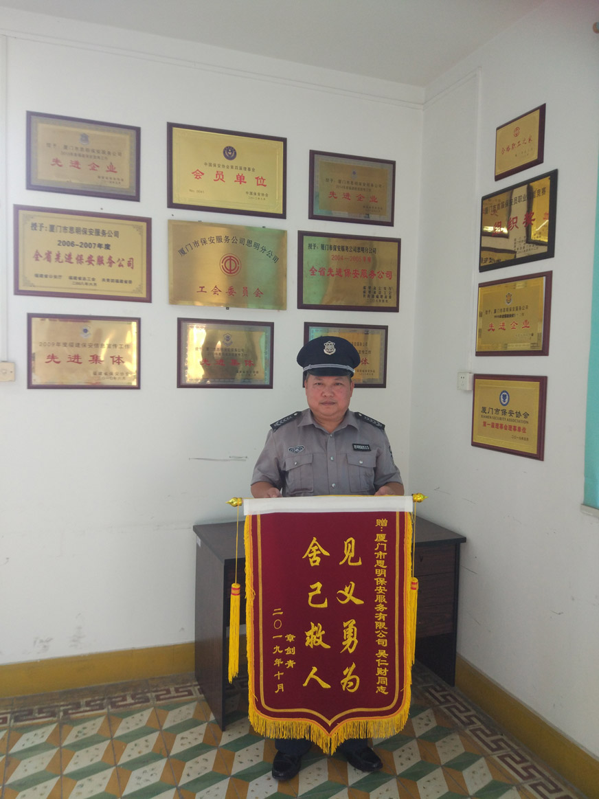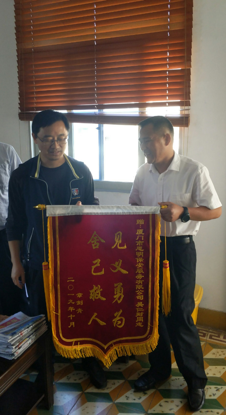 吳仁財(cái)同志是一個(gè)行事低調(diào)、不愛(ài)張揚(yáng)的人,他不希望別人知道他救人的事,若不是事主家屬到公司致謝,大家都不知道他不會(huì)游泳卻奮勇救人的善舉。“沒(méi)想那么多,當(dāng)時(shí)看到危急情況,只是一種本能而已。”這是吳仁財(cái)同志在交談中說(shuō)的最多的一句話。沒(méi)有什么豪言壯語(yǔ),但說(shuō)的字字震撼人心。“見(jiàn)義勇為,舍己救人”錦旗上8個(gè)金黃的大字分外耀眼,小小的錦旗不僅包含著市民對(duì)保安員最真誠(chéng)的謝意,也是對(duì)保安員吳仁財(cái)同志高尚品德的高度贊揚(yáng),更讓我們從一個(gè)普通的保安員身上看到了人性真、善、美的本能,他用實(shí)際行動(dòng)展現(xiàn)了特區(qū)保安人的高尚品質(zhì)和良好的精神風(fēng)貌,向社會(huì)傳遞了源源不斷的暖心正能量。
