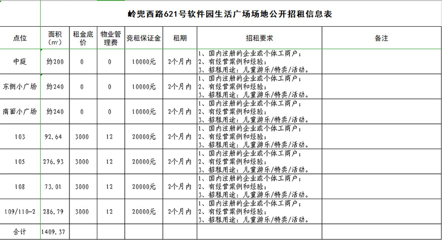 4、招租要求:詳見(jiàn)附表(軟件園生活廣場(chǎng)場(chǎng)地公開(kāi)招租信息表)。