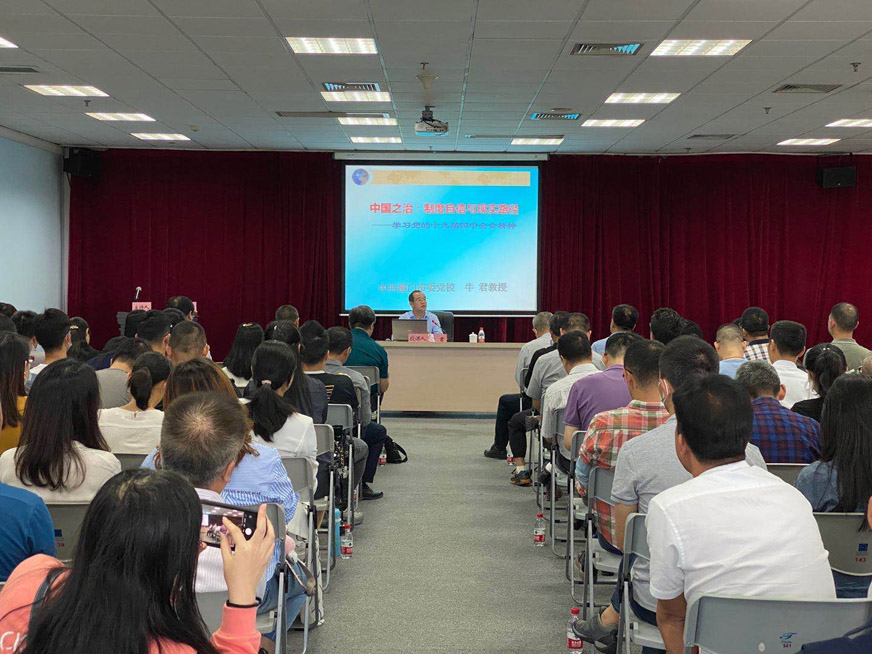 會(huì)上,牛君教授以“中國(guó)之治:制度自信與現(xiàn)實(shí)路徑-學(xué)習(xí)黨的十九屆四中全會(huì)精神”為題,從“四中全會(huì)與《決定》的意義影響”、“推進(jìn)國(guó)家治理現(xiàn)代化的邏輯路徑”、“把制度優(yōu)勢(shì)轉(zhuǎn)化為國(guó)家治理效能”等三個(gè)方面深入解讀黨的十九屆四中全會(huì)的深刻背景和重大意義,對(duì)全會(huì)《決定》提出的總體要求、總體目標(biāo)和重點(diǎn)任務(wù)進(jìn)行了系統(tǒng)解讀。講授中,牛君教授特別結(jié)合中國(guó)應(yīng)對(duì)新冠肺炎重大疫情挑戰(zhàn)等典型事例,深刻闡述了中國(guó)特色社會(huì)主義制度和國(guó)家治理體系的顯著優(yōu)勢(shì),觀點(diǎn)深刻、內(nèi)涵豐富,既有深入淺出的理論闡述,也有聯(lián)系實(shí)際的對(duì)策思考。