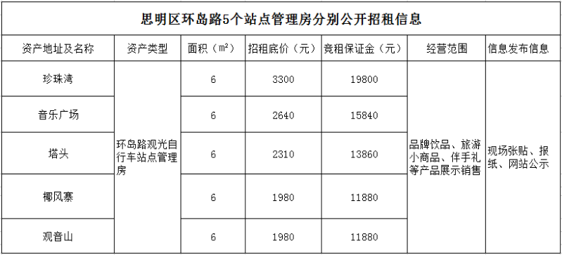 思明區(qū)環(huán)島路5個(gè)站點(diǎn)管理房分別公開招租公告