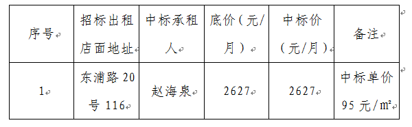 根據(jù)思明區(qū)國(guó)有企業(yè)資產(chǎn)出租管理的相關(guān)制度,我公司于2020年12月18日10:00在廈門(mén)市禾祥西路51號(hào)10A中山房地產(chǎn)公司會(huì)議室,進(jìn)行浦南安置小區(qū)東浦路20號(hào)103等13間店面公開(kāi)招租現(xiàn)場(chǎng)開(kāi)標(biāo)。僅一間店面成交,其余12間店面因無(wú)人應(yīng)標(biāo)而流標(biāo)。現(xiàn)通過(guò)思明控股網(wǎng)站對(duì)外發(fā)布成交公告,內(nèi)容如下: