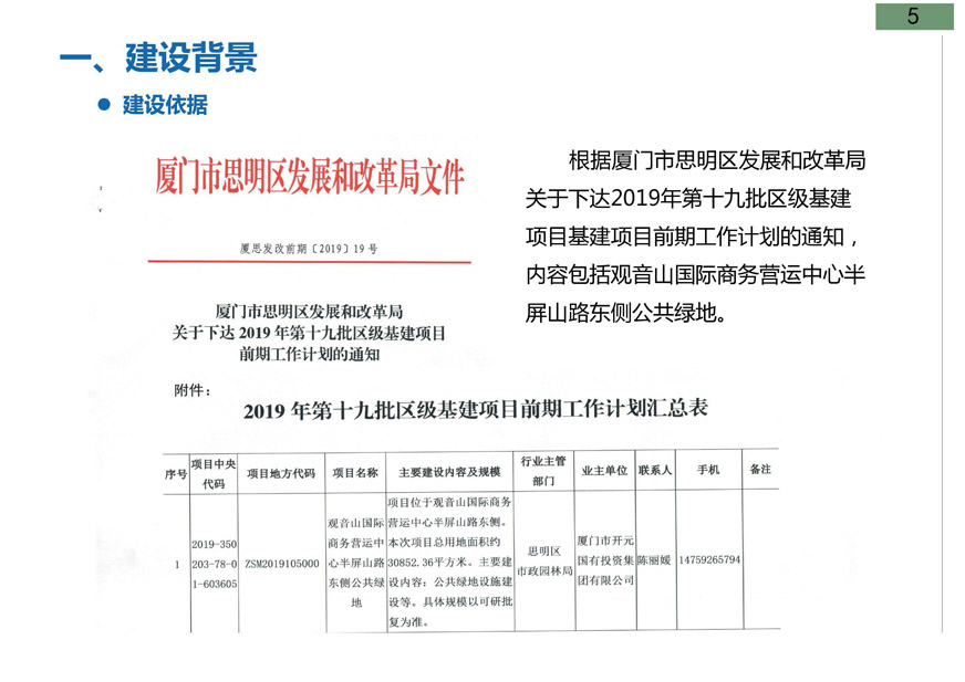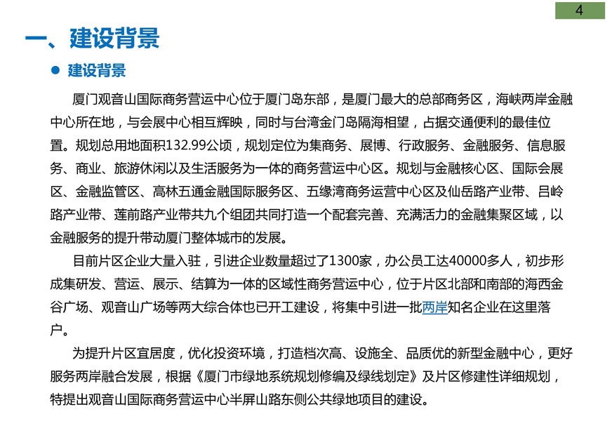 觀音山片區(qū)作為兩岸金融中心片區(qū)重要組成部分,公共綠地建設(shè)、養(yǎng)護(hù)水平的高低關(guān)系到兩岸金融中心建設(shè)的品質(zhì)。為提升片區(qū)景觀形象,優(yōu)化投資環(huán)境,根據(jù)《廈門(mén)市綠地系統(tǒng)規(guī)劃修編及綠線劃定》及片區(qū)修建性詳細(xì)規(guī)劃,廈門(mén)市開(kāi)元國(guó)有投資集團(tuán)有限公司擬建設(shè)觀音山國(guó)際商務(wù)營(yíng)運(yùn)中心半屏山路東側(cè)公共綠地項(xiàng)目,并委托上海東方設(shè)計(jì)研究院進(jìn)行了方案設(shè)計(jì)。根據(jù)廈府辦[2019]115號(hào)文要求,現(xiàn)將設(shè)計(jì)方案予以公布并廣泛征求意見(jiàn)。