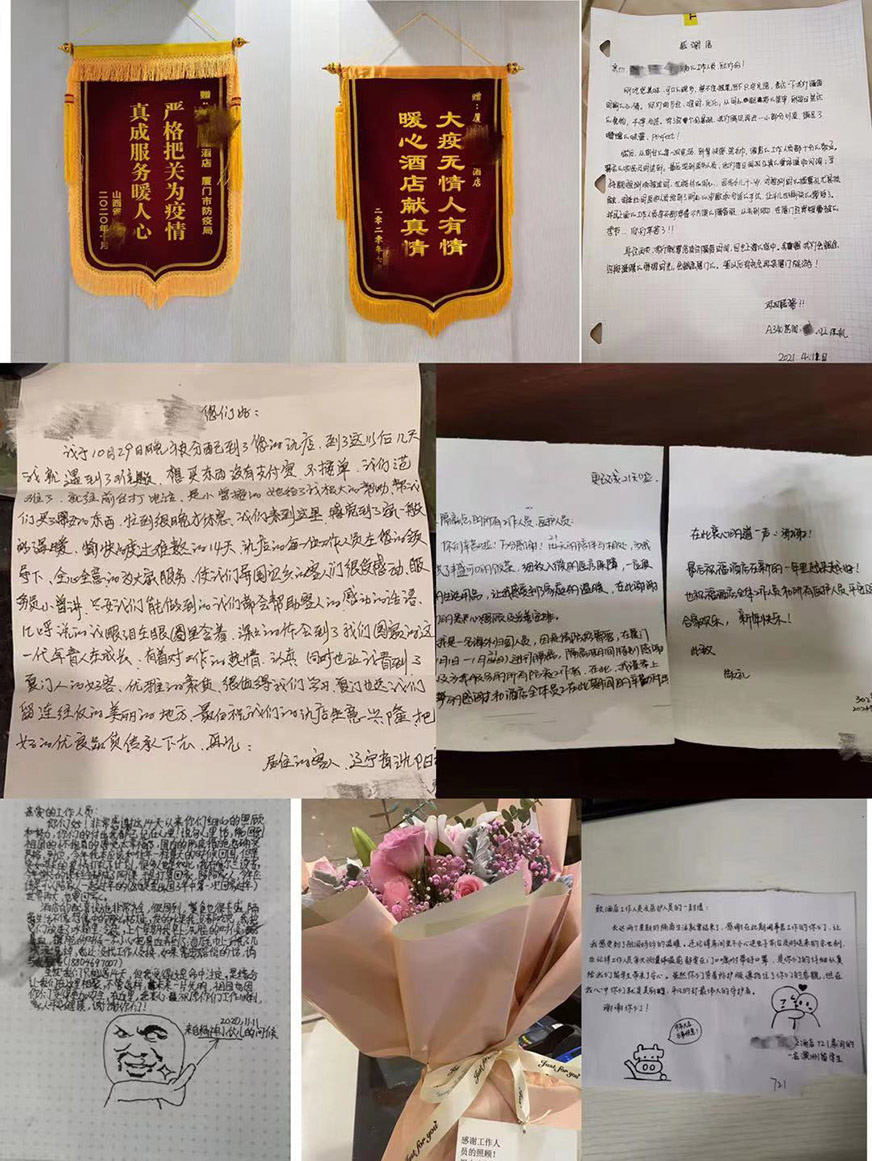 在這400多個日日夜夜中,我們思明區(qū)的隔離酒店專班共接收7萬多名入境旅客。在接收過程中分流到酒店的入境人員大多數(shù)對廈門及各地的防疫政策的不了解、不理解及需要引導(dǎo)等,入境旅客中有情緒激動的老人、有懷孕37周多的待產(chǎn)婦、也有生活無法自理的殘疾人、精神病患者、更有遇到困難尋求幫助的旅客,需要我們酒店專班工作人員耐心細致解釋廈門市及各地的防疫政策、及時疏導(dǎo)隔離人員焦慮的情緒,并引導(dǎo)隔離人員用良好的心態(tài)度過酒店留觀隔離期,體現(xiàn)全心全意為境外人員服務(wù)的高尚情懷。通過我們專班人文關(guān)懷、解難幫困,做到每個留觀人員最終理解這是為了全國人民的健康和為國家的安全應(yīng)盡的義務(wù),都積極主動配合,積極在公眾平臺上傳導(dǎo)正能量,隔離期間常有關(guān)心、慰問工作人員、隔離結(jié)束后常有留下字條、定制錦旗等溫暖舉動,通過寫感謝信、送鮮花、錦旗等方式表達感謝,專班工作得到旅客的認可,在工作上的委屈、苦累和汗水瞬間化為烏有。