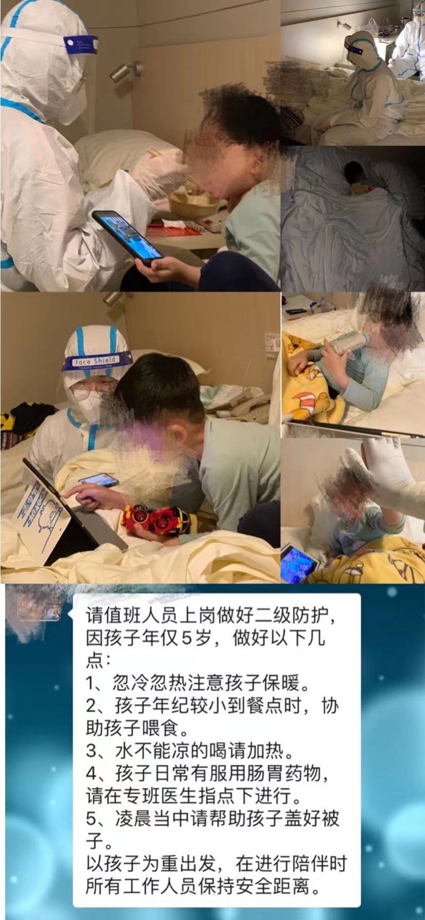 今年4月份,一名年僅5歲的小朋友獨自搭乘飛機到廈門中轉(zhuǎn),分流到隔離酒店接受隔離觀察,在沒有辦法獨自生活自理的情況下,防疫工作人員充當起“臨時保姆”,在保證工作人員安全的前提下照顧、陪伴小朋友。