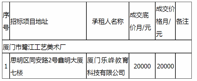 根據(jù)思明區(qū)國有企業(yè)資產(chǎn)出租管理的相關(guān)制度,我司2021年10日上午9:00起于廈門市思明區(qū)觀音山國際商務營運中心2樓2層2會議室進行公開招標現(xiàn)場開標,現(xiàn)通過思明控股網(wǎng)站對外發(fā)布成交公告,內(nèi)容如下:
