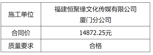 根據(jù)招投標(biāo)管理辦法、思明控股辦[2021]14號(hào)文《采購(gòu)招標(biāo)管理辦法》的相關(guān)規(guī)定,我司負(fù)責(zé)龍山文創(chuàng)園標(biāo)識(shí)牌制作及工業(yè)設(shè)計(jì)中心大門左側(cè)空調(diào)外機(jī)圍擋工程直接發(fā)包福建恒聚緣文化傳媒有限公司廈門分公司實(shí)施,現(xiàn)通過(guò)思明控股網(wǎng)站于2021年12月27日至2021年12月30日進(jìn)行成交結(jié)果公示,內(nèi)容如下: