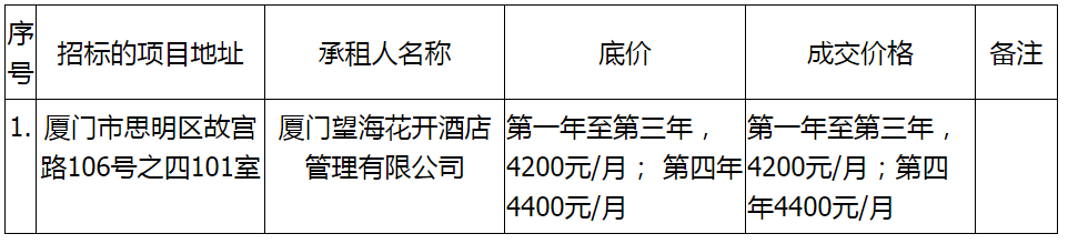 根據(jù)思明區(qū)國有企業(yè)資產(chǎn)出租管理的相關制度,我司于2021年12月31日上午9:00起在廈門市前埔工業(yè)園1號全和公司六樓會議室進行公開招租現(xiàn)場開標,現(xiàn)通過思明控股網(wǎng)站對外發(fā)布成交公告,內(nèi)容如下:
