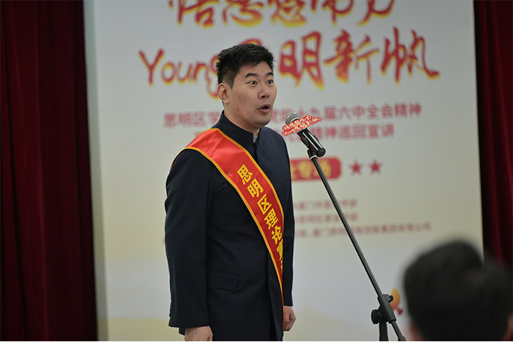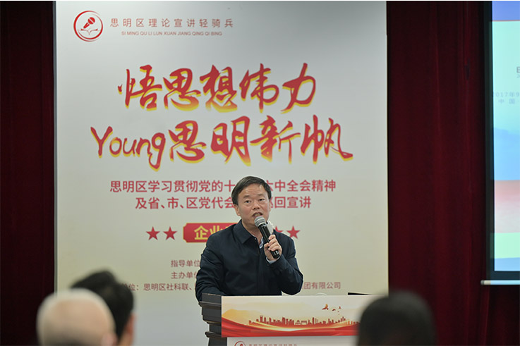 為深入學習貫徹黨的十九屆六中全會精神及省、市、區(qū)黨代會精神,扎實推動黨史學習教育持續(xù)深入開展,由中共廈門市委宣傳部指導,中共思明區(qū)委宣傳部主辦,思明區(qū)社科聯(lián)、思明區(qū)文聯(lián)、思明控股集團協(xié)辦的“悟思想偉力 Young思明新帆”思明區(qū)學習貫徹黨的十九屆六中全會精神及省、市、區(qū)黨代會精神巡回宣講活動(企業(yè)專場)于1月14日下午舉行,區(qū)委宣傳部部務會成員、區(qū)文聯(lián)主席李春華同志蒞會指導,控股集團黨委副書記潘用樹同志出席會議,集團所屬51名黨員參會聆聽宣講。