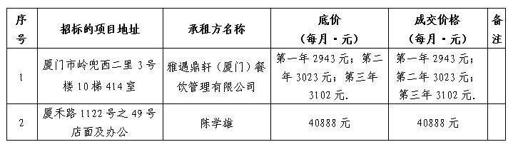 根據(jù)思明區(qū)國(guó)有企業(yè)資產(chǎn)出租管理的相關(guān)制度,我司2022年1月25日上午9:00起于廈門市前埔工業(yè)園1號(hào)全和公司七樓會(huì)議室進(jìn)行公開(kāi)招租現(xiàn)場(chǎng)開(kāi)標(biāo),現(xiàn)通過(guò)思明控股網(wǎng)站對(duì)外發(fā)布成交公告,內(nèi)容如下: