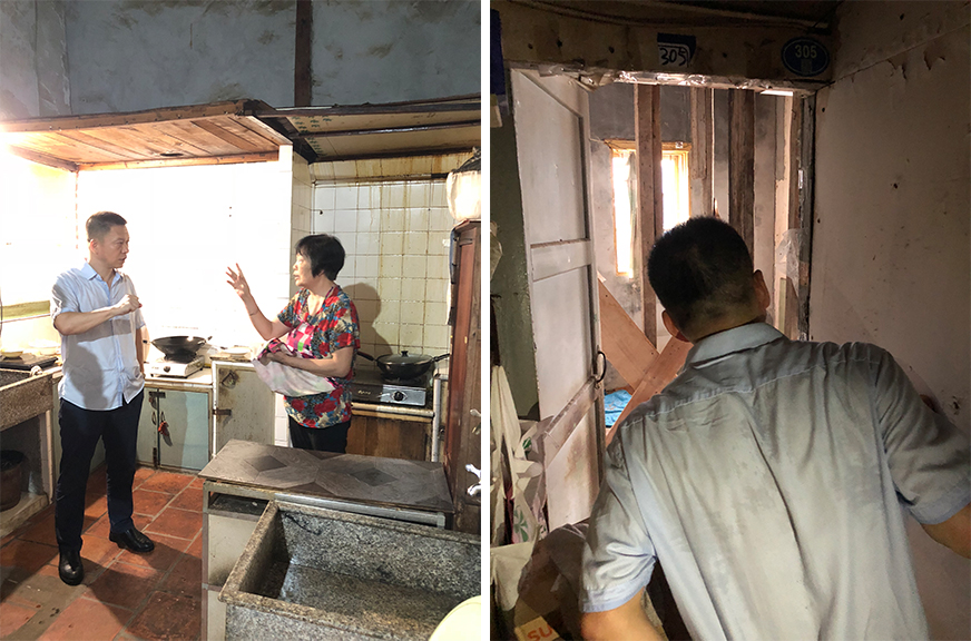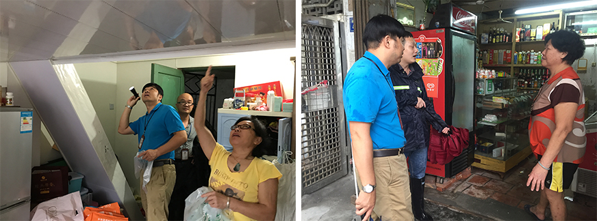 當工作人員巡查至雙蓮池時,雙蓮池已成一片澤國,而雙蓮池52號更是猶如海中孤島一樣積水極深,工作人員不顧積水之深,穿過過膝的積水來到住戶家中,拿起掃把、拖把幫忙掃除房屋內(nèi)的積水,并向上級申請抽水泵排水已解燃眉之急。經(jīng)過工作人員與住戶的不懈努力,積水終于被清理干凈,也還住戶一個安心的家。