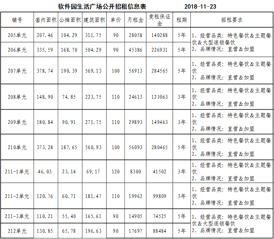 招租要求:詳見附表(軟件園生活廣場公開招租信息表)
