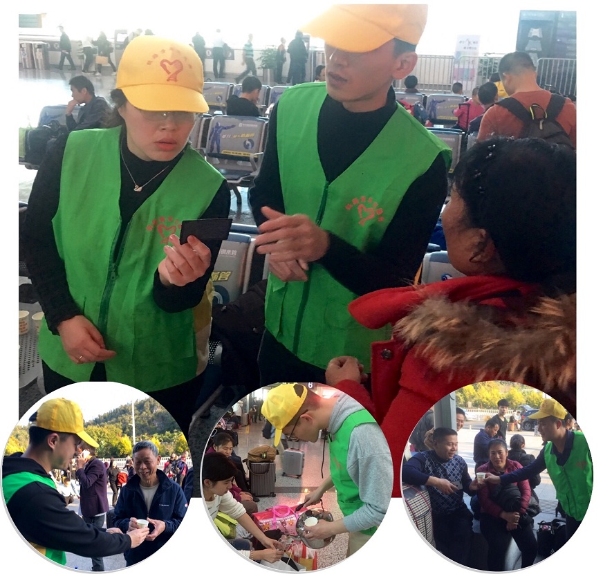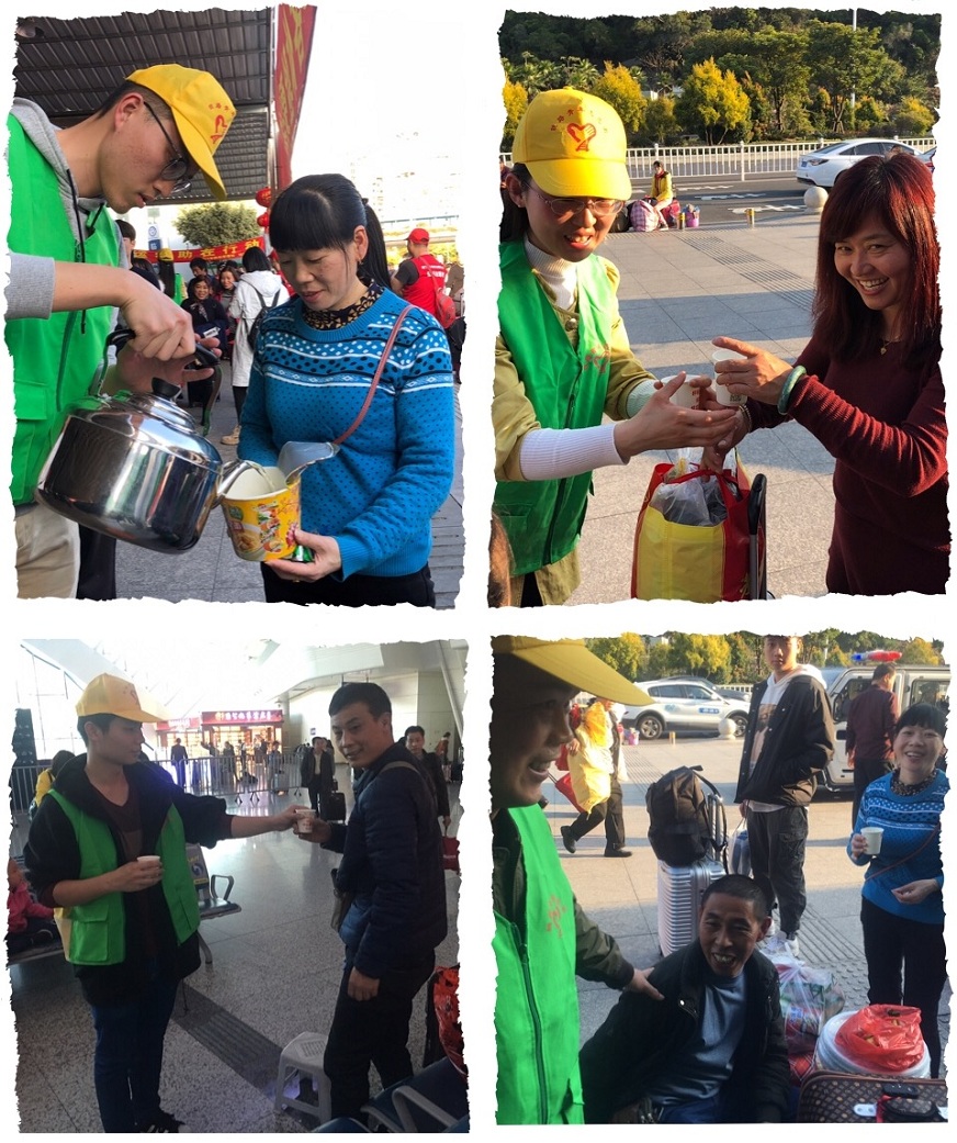“請問我這張票要去哪里候車?”“請問一下梧村車站怎么走?”支部同志身著志愿者服裝一到場,就有許多受困旅客上前咨詢。每年春運期間國內(nèi)各個火車站都會加派人手,做好各項準備工作。但即便如此,依然會有許多旅客遇到困難,并難以在密集的人群中尋求幫助,在這個時候,分布在火車站各個地方的志愿者就是受困旅客最好的幫手。無論是各個車次的具體候車點、自助取票機的位置,還是周邊的餐飲、百貨、汽車站路線,甚至旅客需要開水時,志愿者都有隨身攜帶熱水壺和紙杯為旅客提供方便。支部同志們無論走到哪,身邊都會圍繞許多尋求幫助的受困旅客,支部每一位同志都以最飽滿的熱情悉心答疑,以實際行動為人民服務。