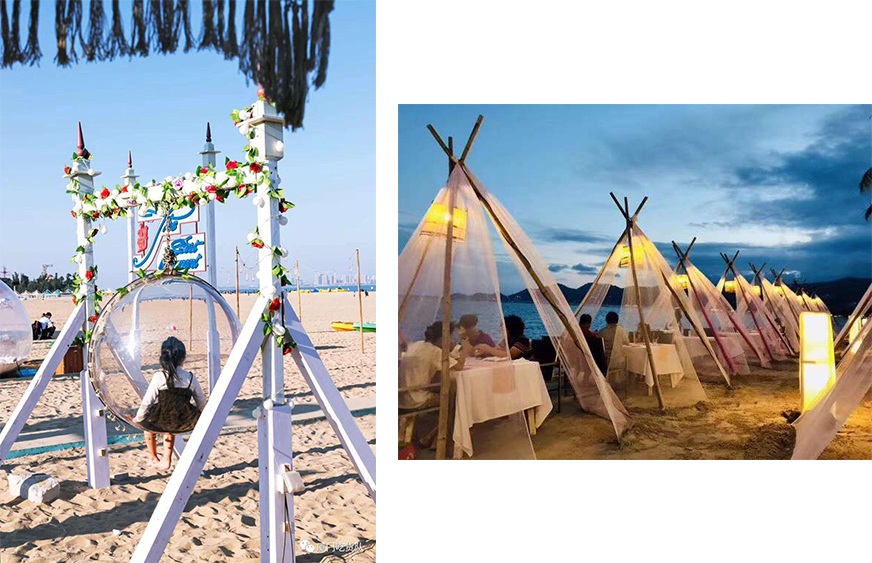 沙灘上浪漫而有趣的泡泡屋及帳篷,極具熱帶風情的椰子樹等裝飾,過往行人無不駐足拍照,據(jù)說這是觀音山在抖音上知名的“網(wǎng)紅地”,看似忽然爆紅的背后,它的創(chuàng)始人楊翰斌其實在觀音山這片“碧海金沙”中已5年有余,獨到的思維及眼光讓他從一批批不停更迭的商戶中脫穎而出,成了他在得天獨厚的環(huán)境中生存與“淘金”的制勝法寶。