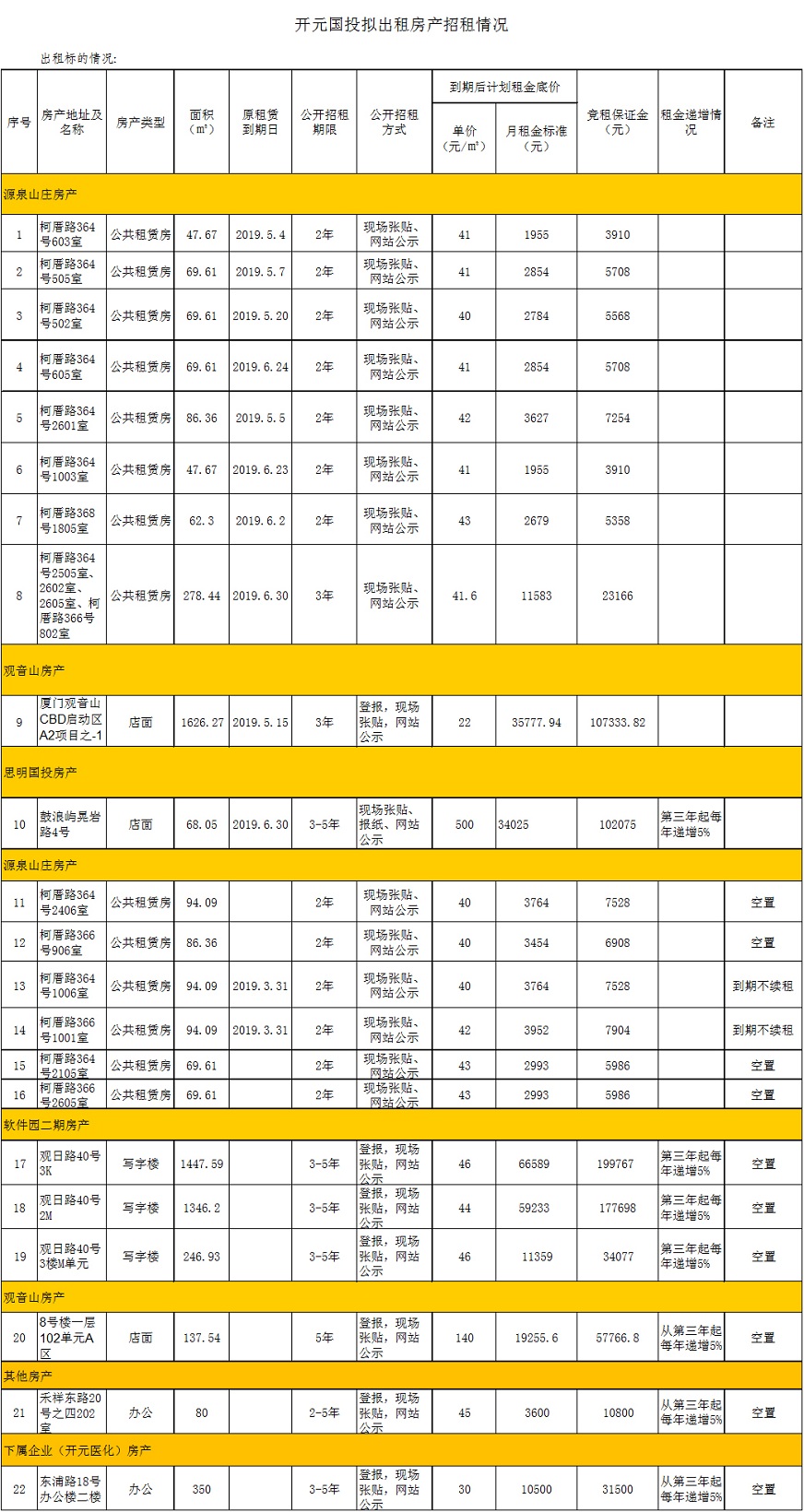 開元國投2019年4-6月到期、空置房產(chǎn)公開招租