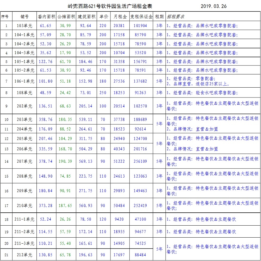 招租要求:詳見附表(軟件園生活廣場(chǎng)公開招租信息表)